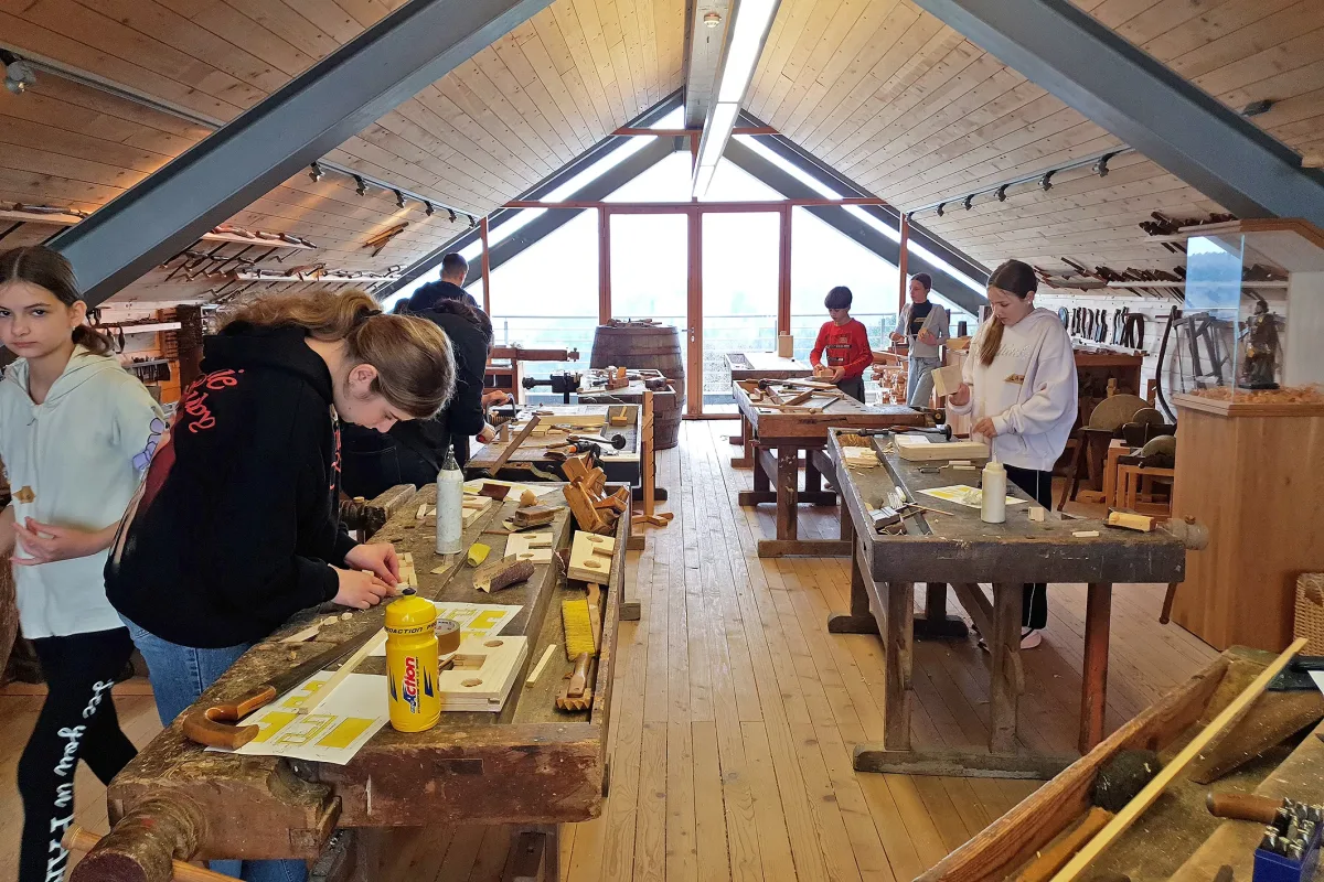 Mladi pri ustvarjanju z lesom v muzeju LESARIUS (foto Mizarstvo Kos).