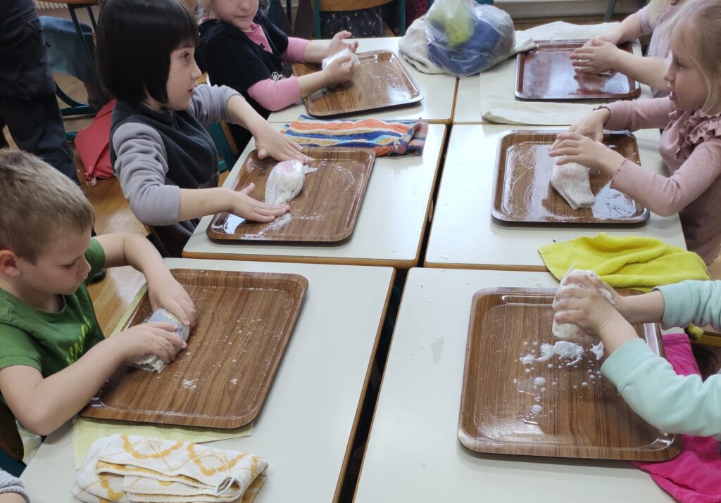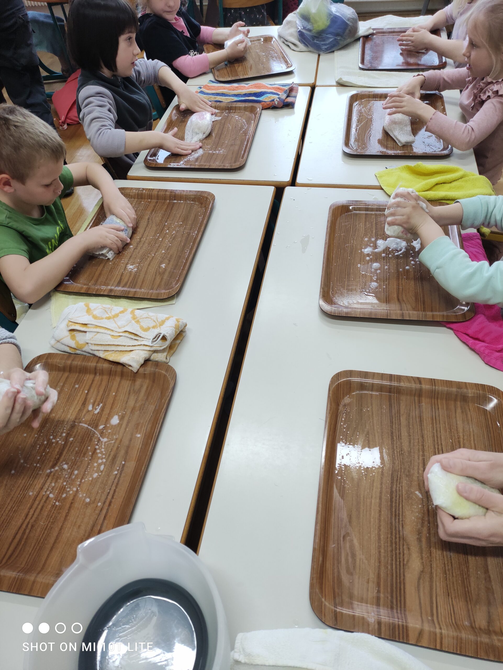 Učenci PŠ Motnik med ustvarjanjem z volno