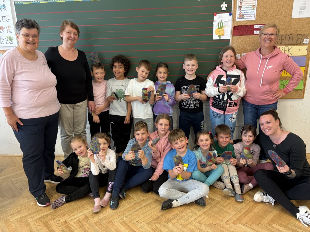 Zadovoljni učenci 1. in 2. razreda podružnične OŠ Šmartno v Tuhinju Sela z učiteljico Dašo in mentoricami DRD Kamnik po končani delavnici